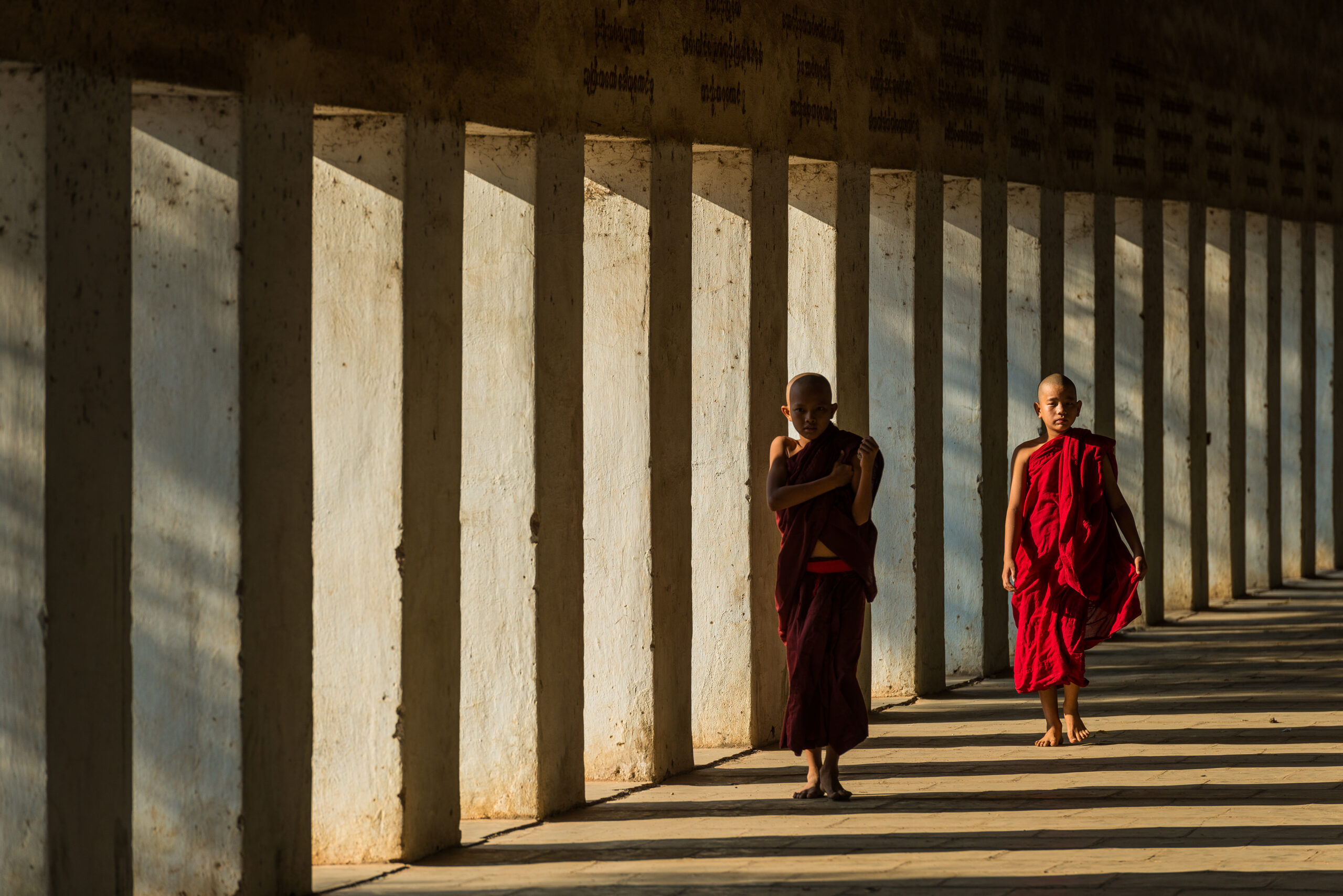 Myanmar (Birmanie), Nyaung U, 15/03/2017 - Jeunes Moines dans l'allee d'un Temple Boudhiste. Photographie de Julien GERARD, Agence 1H23.