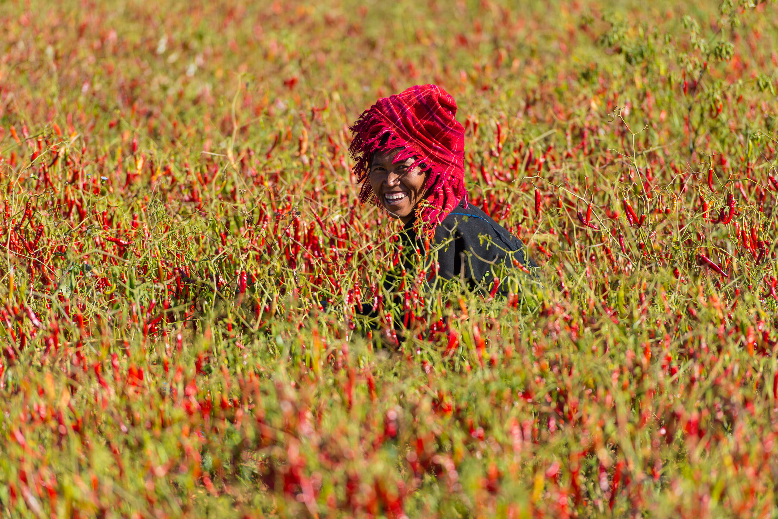 Myanmar (Birmanie), 10/01/2015 - Agricultrice dans un champd de piments entre Kalaw et Inlé au Myanmar. Photographie de Julien GERARD / Agence 1H23.